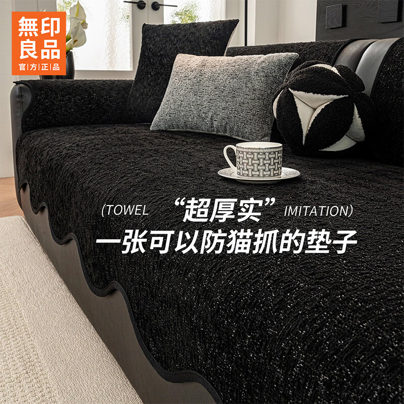 无印良品劳伦斯沙发垫子四季通用防滑真皮沙发专用坐垫防猫抓沙发座盖垫 异形雅澜-黑色 【高克重雪尼尔丨肌理质感丨亲肤 70*180cm (大两人位 )