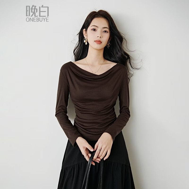 晚白2026年春款时尚优雅荡领miu系上衣亲肤柔软气质显瘦T恤衫女 深咖色 M