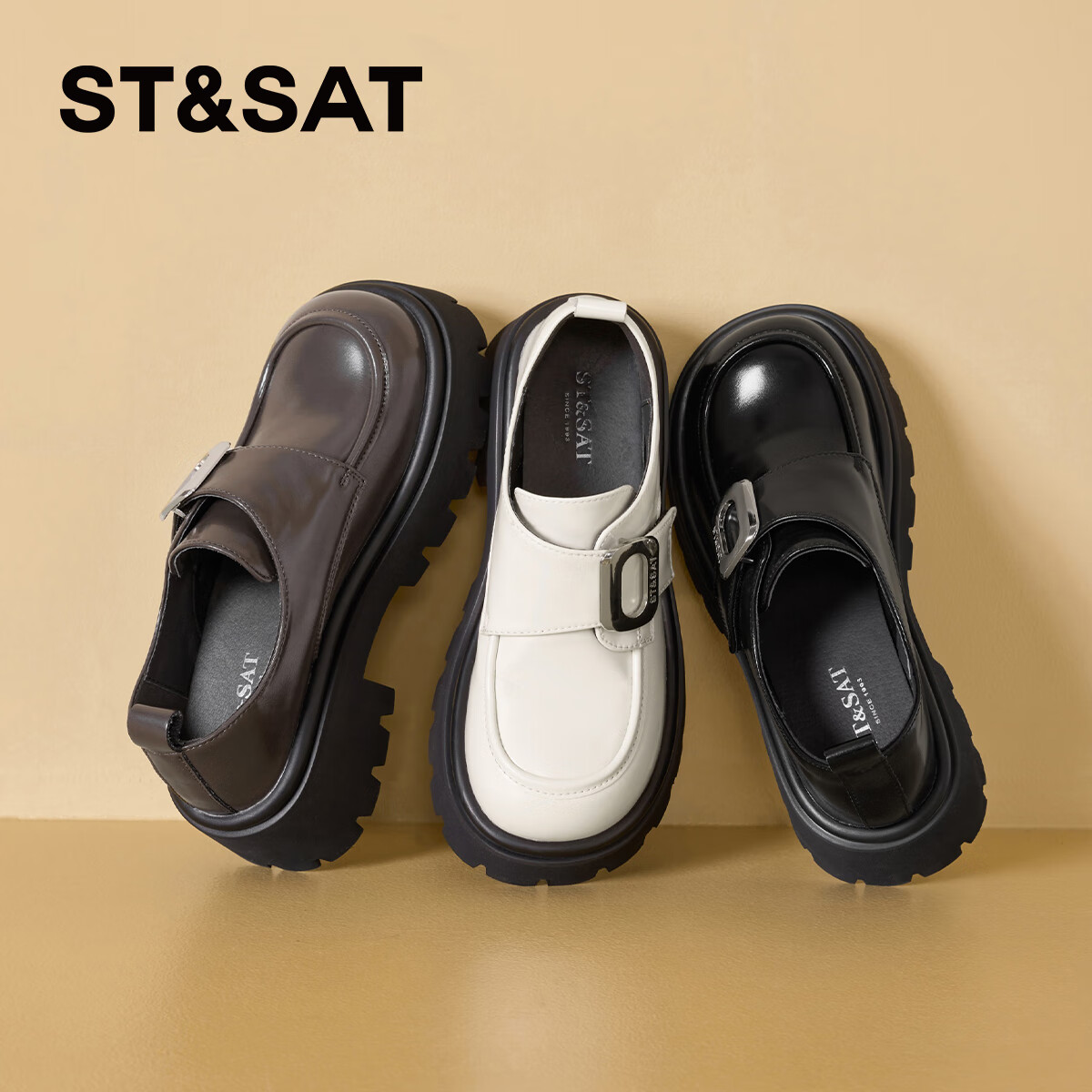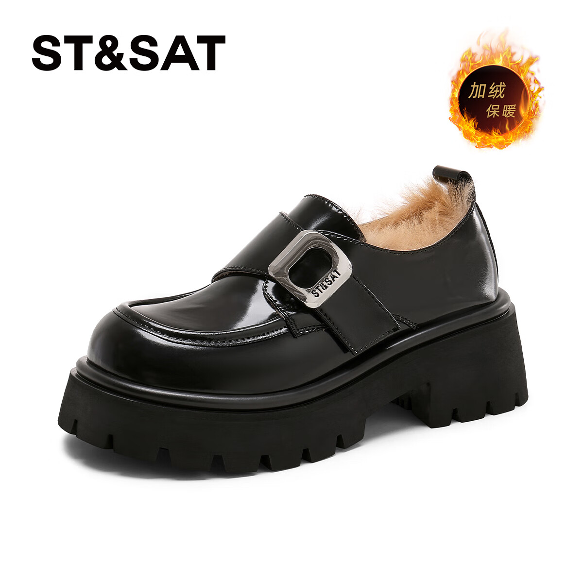 星期六2025新款厚底乐福鞋女英伦风粗跟单鞋一脚蹬黑色百搭小皮鞋 黑色【加绒款】 38