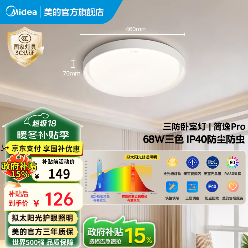 美的(Midea)吸顶灯奶油风卧室灯圆形灯具卧室房间吸顶灯阳台灯走廊过道灯简逸 68W|三段调色|简约款