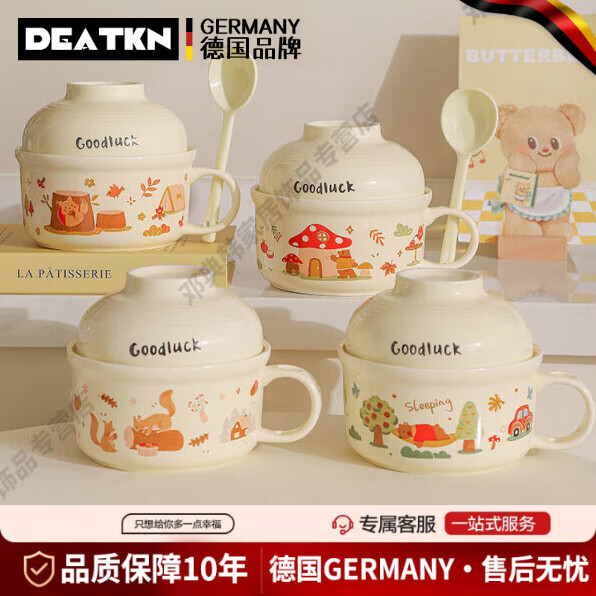 DEATKN德国陶瓷泡面碗带盖学生宿舍饭堂打饭碗带手柄方便面碗大容量面碗 树桩松鼠【碗+盖+勺+筷】