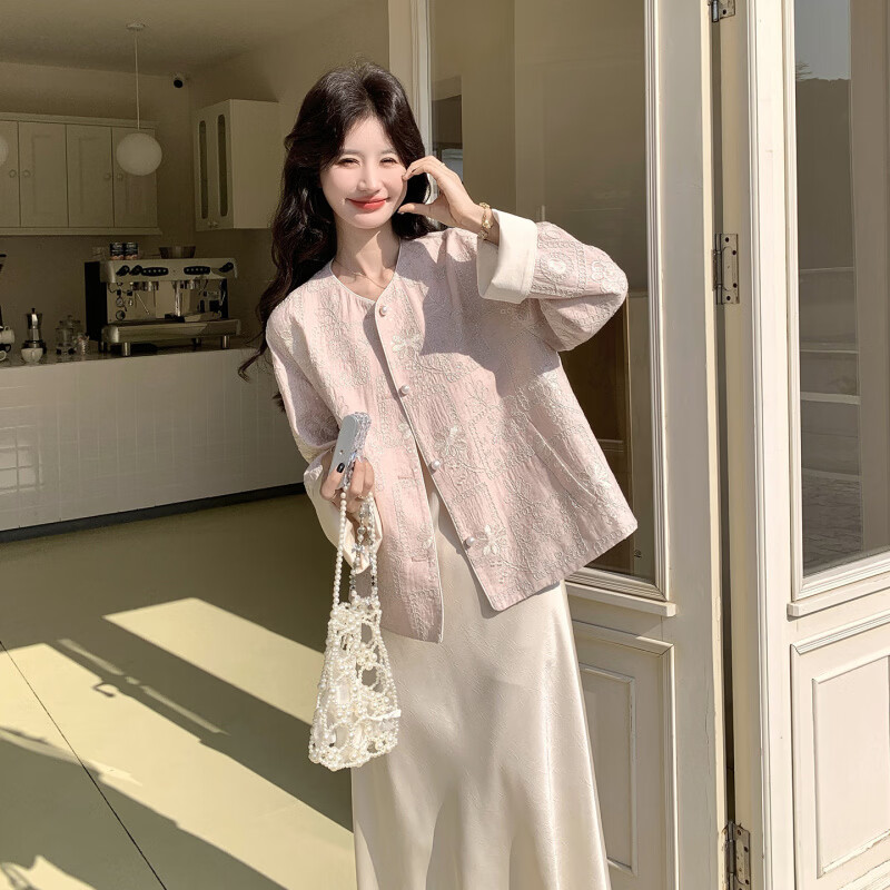 MODX新中式套装裙女2026春季复古气质巨好看刺绣外套缎面连衣裙两件套 粉色外套+连衣裙(面料升级版) M (115斤内)