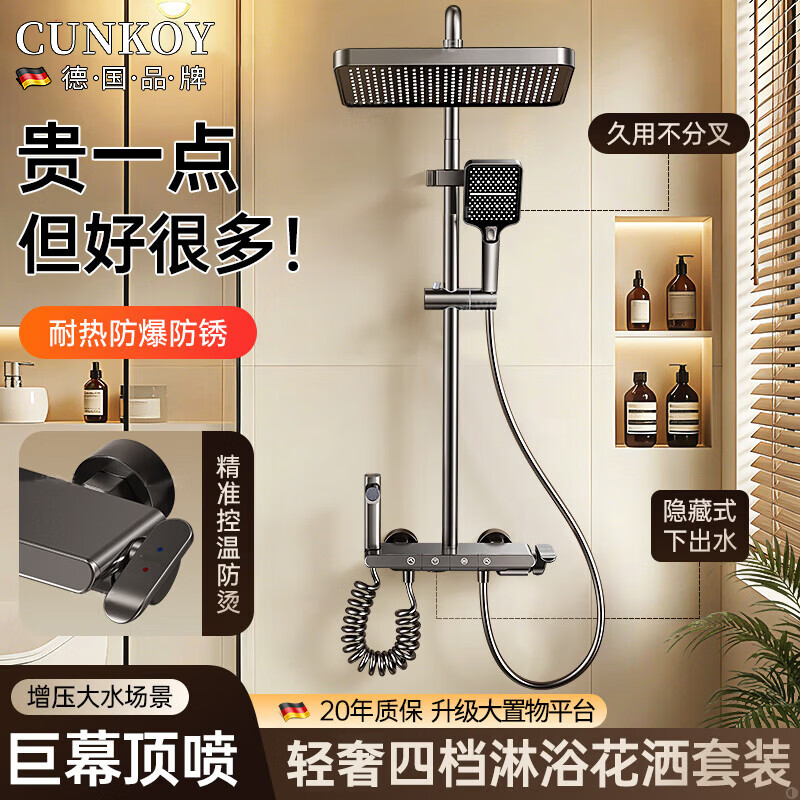 CUNKOY【德国】淋浴花洒套装一体冷热增压花洒淋浴全套一整套2025新款 钢琴键-轻奢四档淋浴花洒套装 四档钢琴键丨巨幕顶喷丨大置物平台