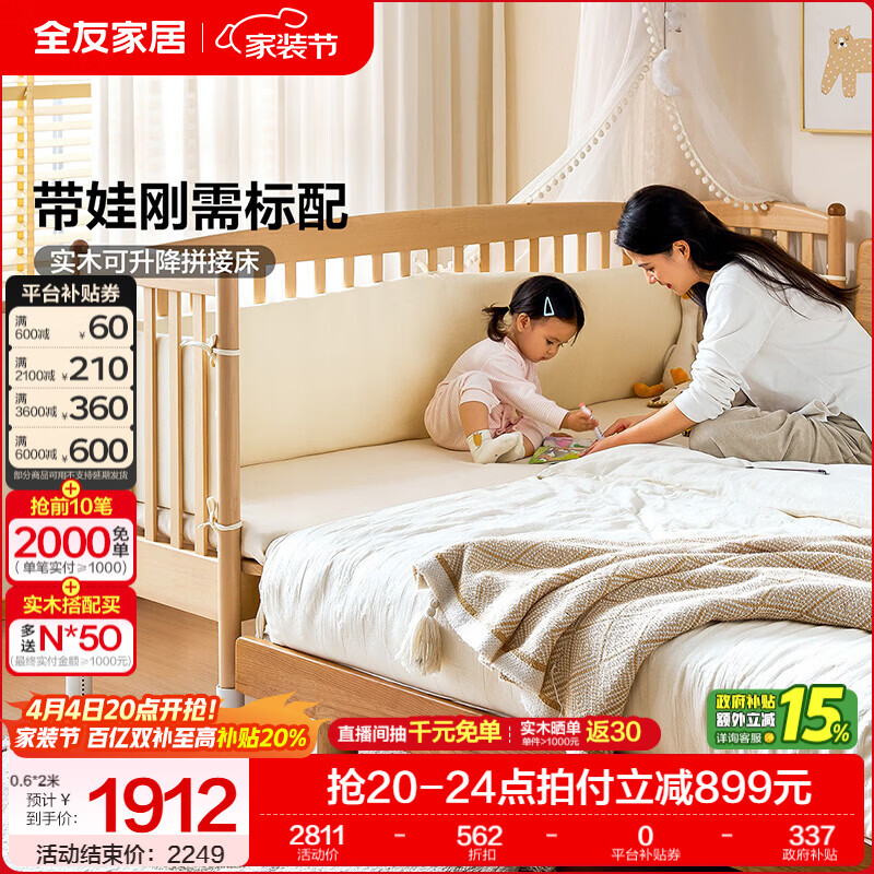 全友家居原木风家具实木儿童床次卧室拼接床婴儿床带护栏加床拼床KS 【山毛榉+松木】拼接床+床垫 0.8米×2米