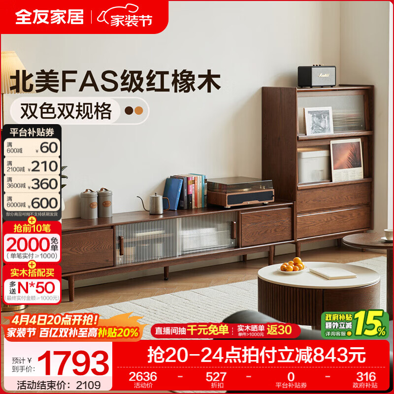全友家居原木风茶几电视柜客厅轻奢高级感2026新款组合柜沙发边柜家具 【胡桃色 | 红橡木】1.8 米电视柜-预约