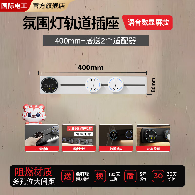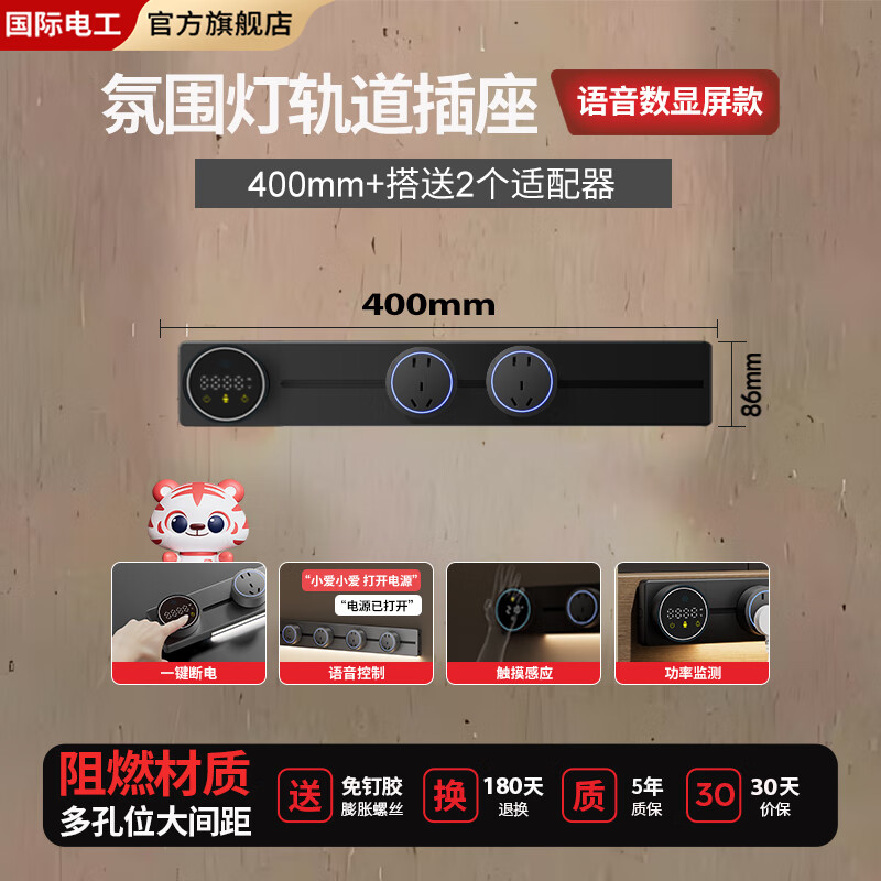 FDD国际电工数显智能移动轨道插座语音触摸感应壁挂排插厨房明装电源插板白色 屏显智能语音带灯【40CM*2个五孔】