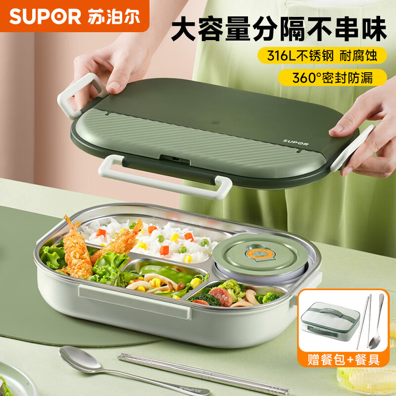 苏泊尔(SUPOR)316L不锈钢分格餐盘学生用饭盘大容量上班族食堂打饭便当盒 灰绿2000ml【汤碗+餐具+提包】