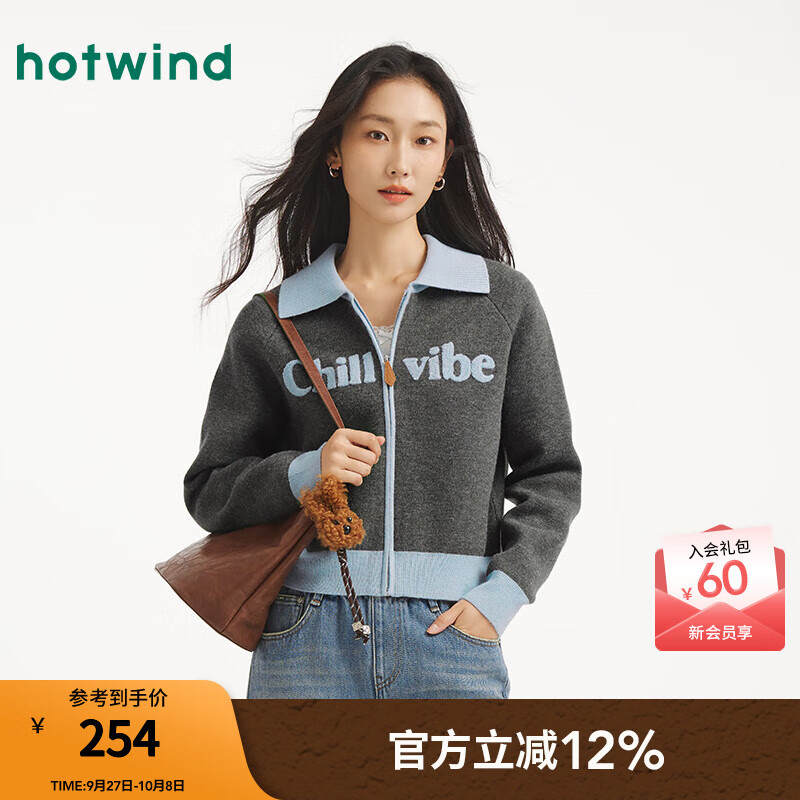 热风【商场同款】女士针织衫拉链开衫2025年秋新款休闲复古翻领针织衫 09灰色 S