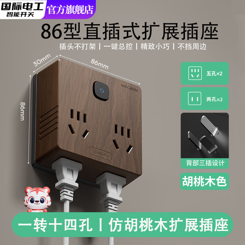 国际电工86型转换器多功能插座扩展插排一转多无线插线板直插式转换插头 仿胡桃木丨一转十四孔扩展插座