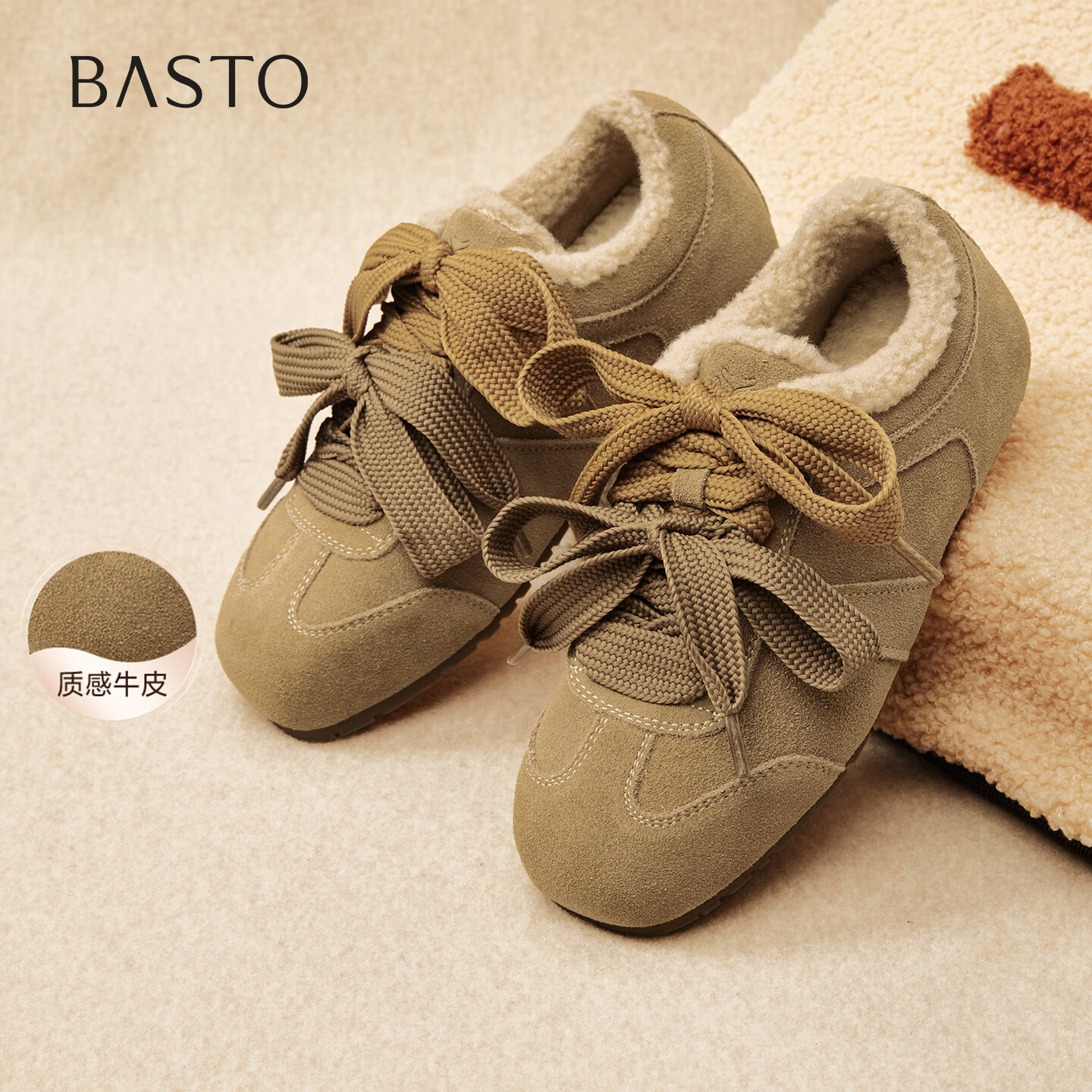 百思图2025冬季新款德训鞋复古加绒保暖女运动休闲鞋W0671DM5 卡其色 37