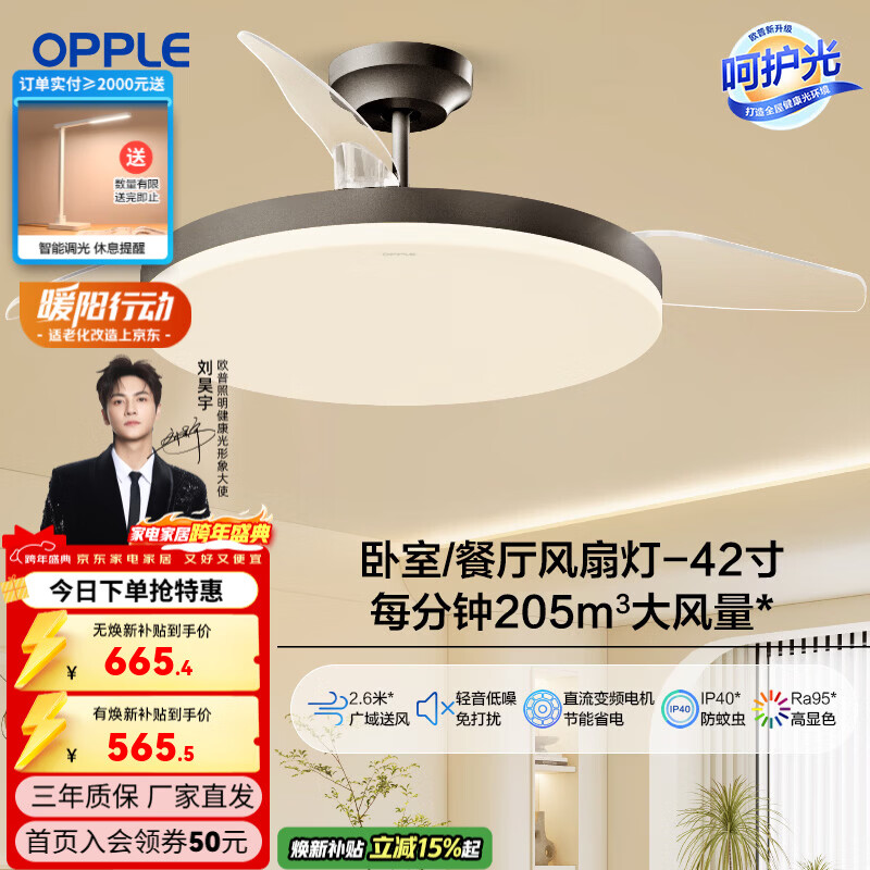 欧普照明(OPPLE)风扇灯吊扇灯隐形扇卧室餐厅超静音全光谱1级能效简约风扇一体 黑-42寸48瓦-遥控