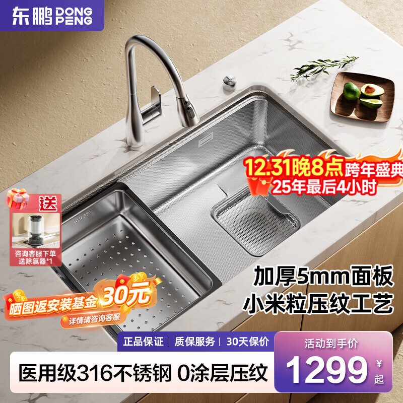 东鹏(DONGPENG)316L不锈钢水槽厨房洗菜盆大单槽小米粒压纹手工盆洗碗池右侧排水 75*43【母婴级316不锈钢】珠光压纹0涂层-全铜三档抽拉
