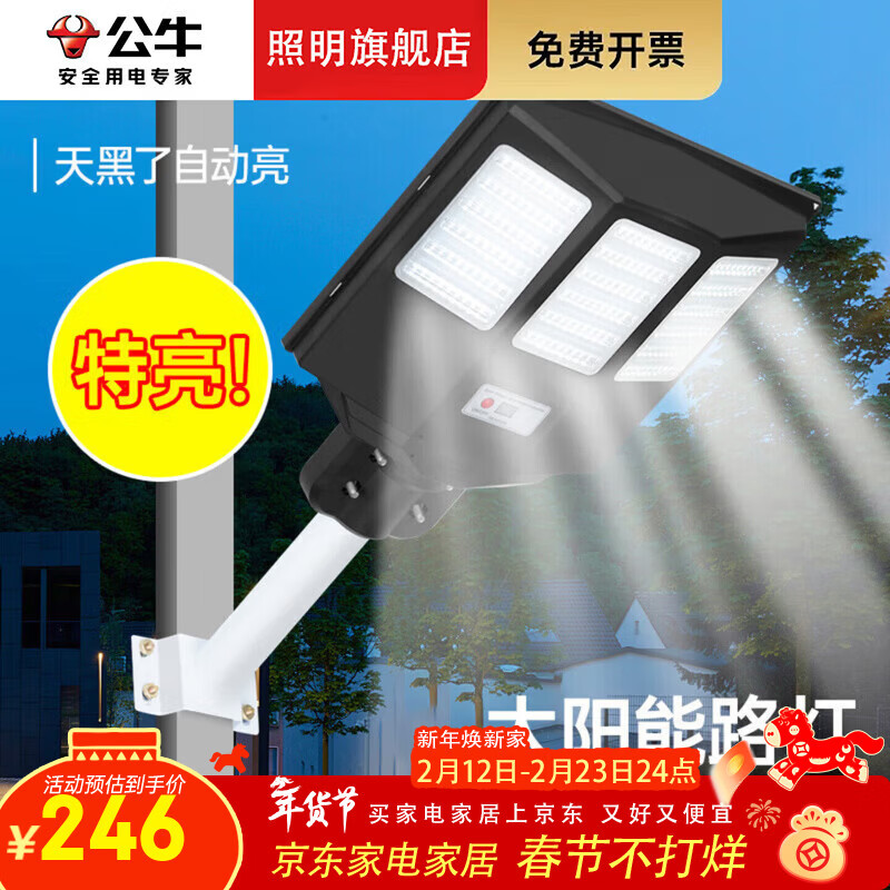 公牛太阳能户外照明灯 庭院灯农村院子家用防雨大功率路灯LED室外射灯 【遥控+光感】150W丨约120㎡