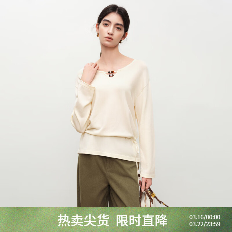 自巧小个子串珠系带收腰冰丝圆领T恤落肩袖上衣女2026年春季新品 巧米色 XS (尺码:2)