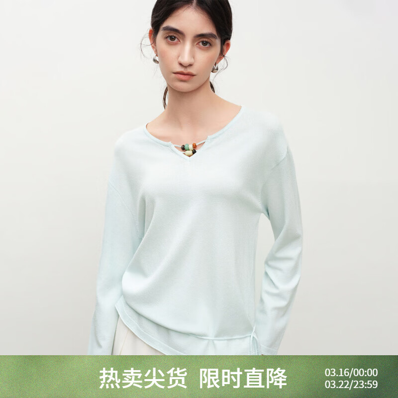 自巧小个子串珠系带收腰冰丝圆领T恤落肩袖上衣女2026年春季新品 浅水蓝 XS (尺码:2)