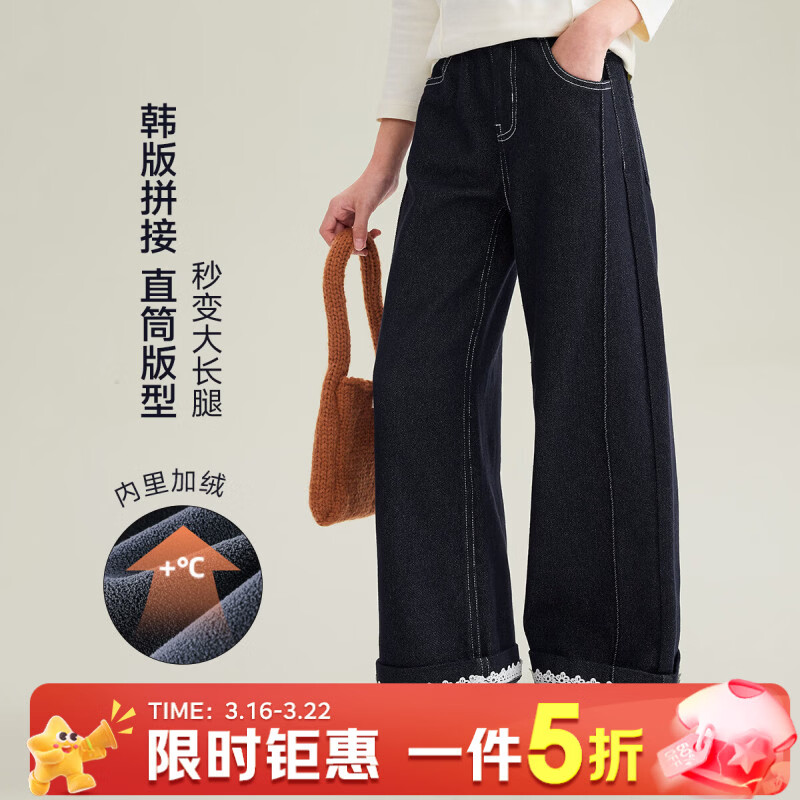 媛媛公主女童加厚牛仔裤25秋冬款儿童花边设计感直筒裤女大童百搭长裤 牛仔蓝 110