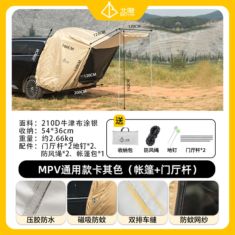 钓哈哈(Diaohaha)大型SUV后备箱车尾帐篷适用MPV带天幕便捷搭建大面积遮阳通用款 卡其色+门厅杆1套
