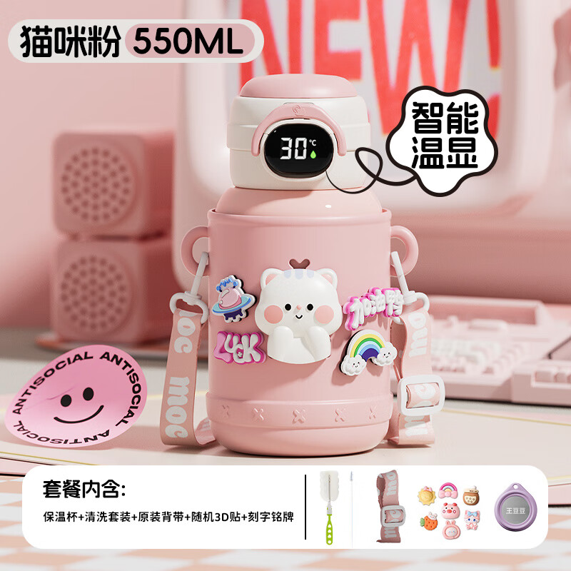 DEATKN德国品牌儿童保温杯男女孩上学专用宝宝幼儿园水杯2025新款小学生 智能温显猫咪粉 550ml 3D立体贴7+清洗套装+背带