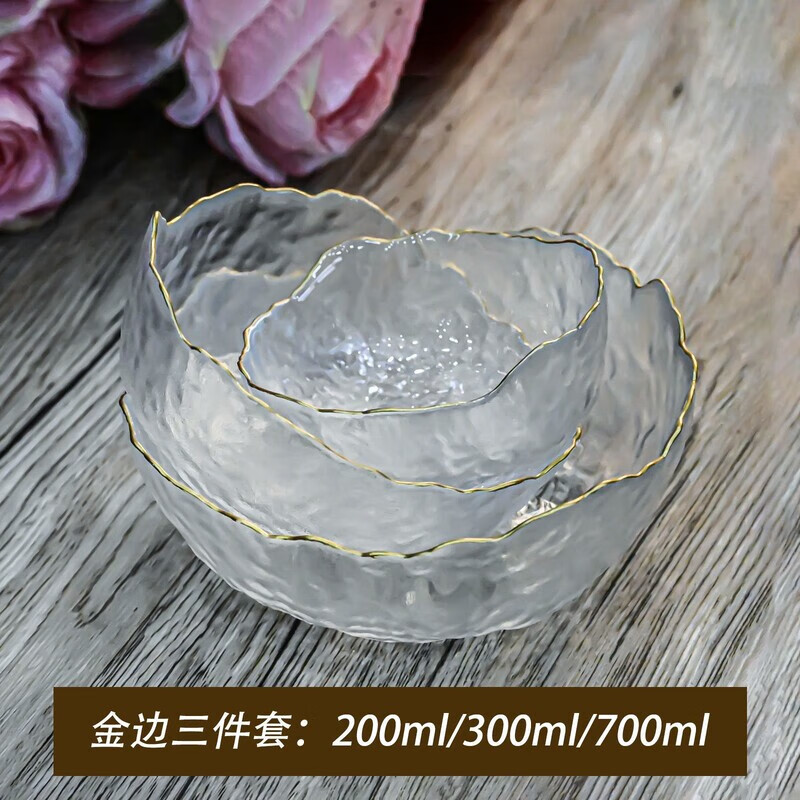 DEATKN日式锤纹金边玻璃碗透明沙拉碗家用水果碗创意水果盘网红餐具套装 直径:大号16cm中号13cm小号10cm 【加厚金边碗】锤纹三件套大中小