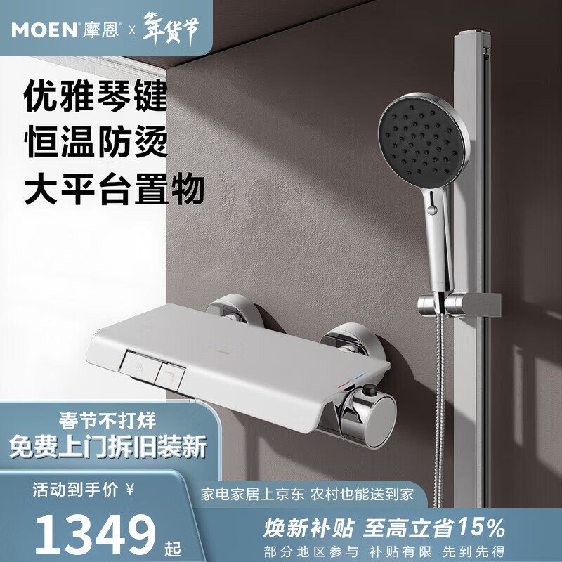摩恩(MOEN)诺因系列钢琴按键智能恒温花洒套装淋浴无极花洒大平台置物51432 诺因 钢琴键两功能恒温龙头软连接