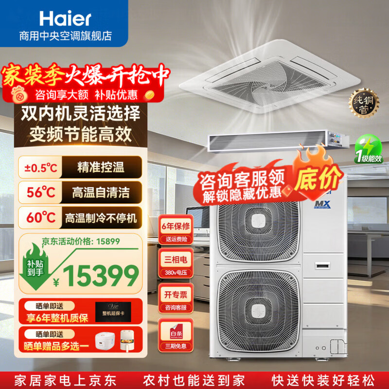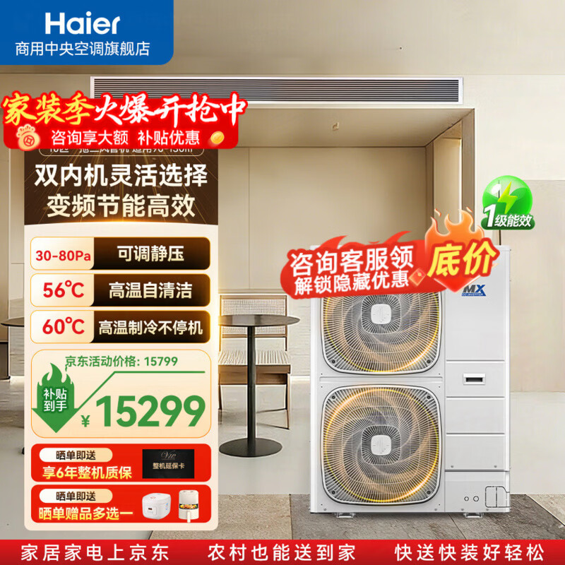 海尔中央空调10匹一拖二天花机吸顶机/风管机一级能效 内外机自清洁 智慧风不直吹 会议室/餐厅/商铺 冷暖 10匹 一拖二风管 一级能效
