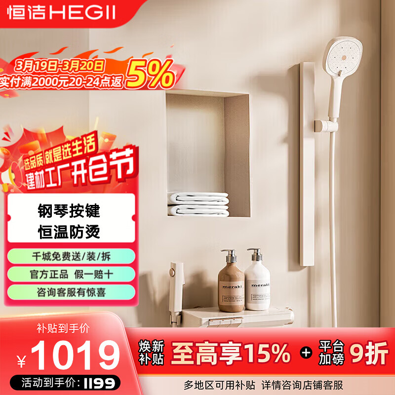 恒洁(HEGII)淋浴花洒套装钢琴按键加宽大平台小户型分体三功能淋浴花洒S21B 【恒温款】S21B白色