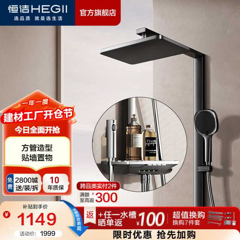 恒洁(HEGII)花洒淋浴套装 智能除垢方管贴墙琴键大置物台淋浴花洒套装 【双重自动除垢】956-333C-SH
