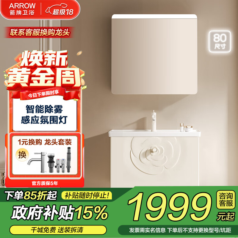 箭牌(ARROW)山茶花浴室柜E0板材洗脸盆卫生间洗手盆洗漱台陶瓷台盆一体盆组合 【感应氛围灯/智能除雾】80cm(30天发)