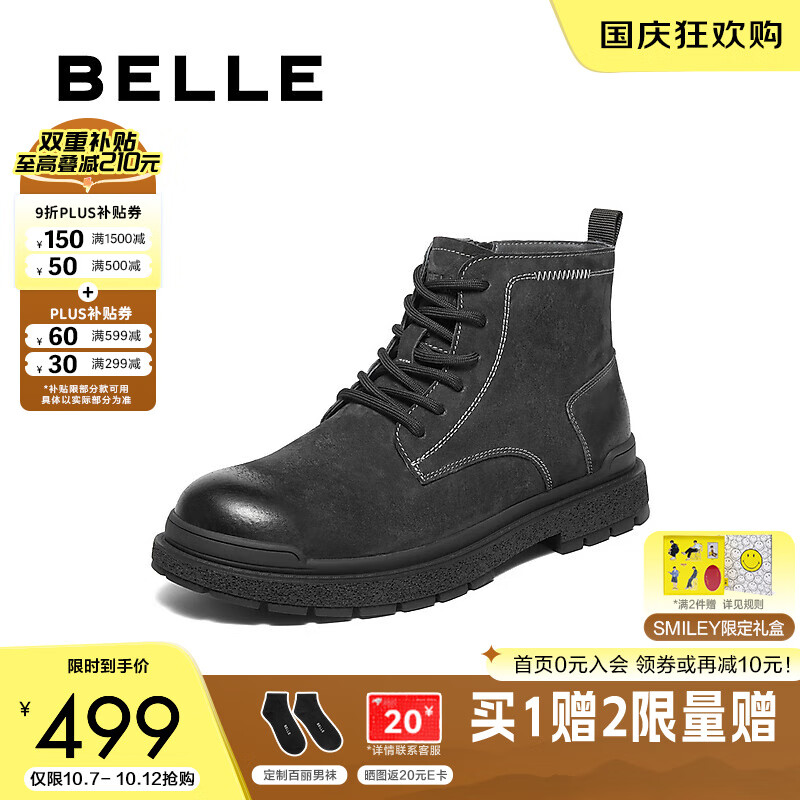 百丽户外潮搭工装靴男25新款冬季厚底休闲马丁靴加绒A2170DD5 黑色-单里 42 (260mm)