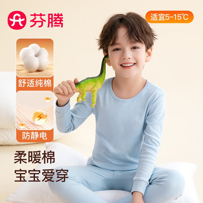 芬腾保暖内衣男童100%纯棉防静电圆领保暖打底睡衣套装儿童柔暖秋衣 浅蓝 120