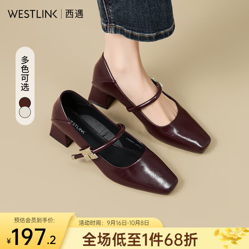 西遇中跟单鞋女2025新款秋季复古百搭酒红色方头粗跟玛丽珍鞋 红色 37 (235)