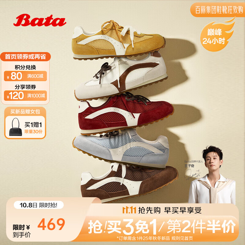 Bata王子奇同款休闲鞋女2025春秋新款通勤百搭德训运动鞋B6831AM6 黄色 37