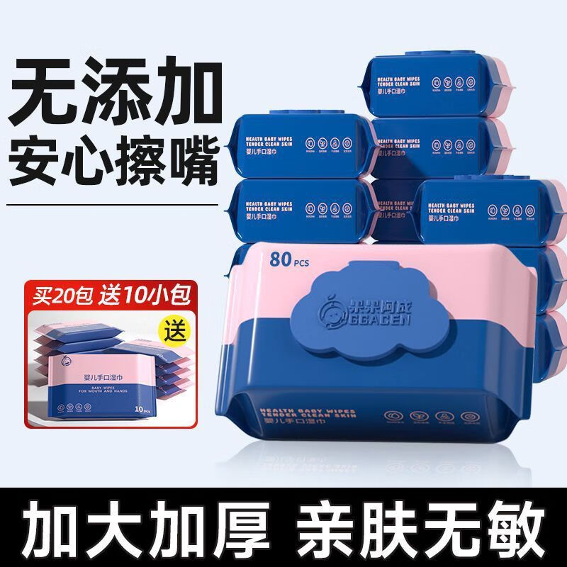 AILUKI果果阿成婴儿湿巾孕妇新生儿手口专用湿纸巾无添加80抽加大加厚装 孕婴可用/安全无添加 20包【纯水+10包便携装】