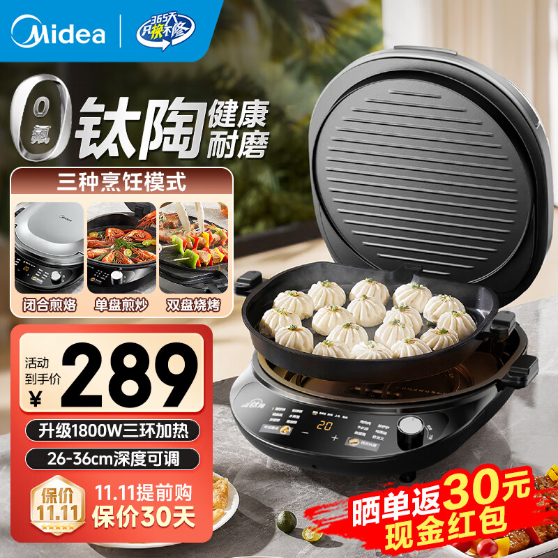 美的(Midea)钛陶电饼铛 30cm烤盘煎饼锅家用双面加热煎烤机烙饼大尺寸加深烤盘上下盘可拆洗早餐机烤肉电饼档 钛陶健康涂层丨三环加热