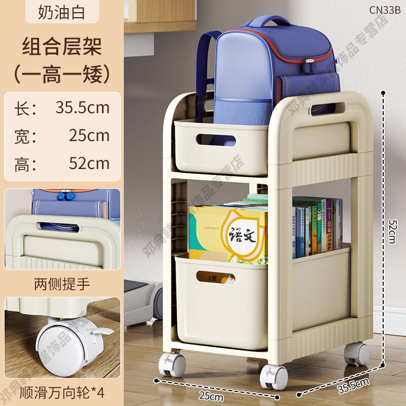 DEATKN德国书包置物架可移动小推车书本收纳架神器家用多层放书包桌下 奶白色-【1高+1矮】带轮可拆卸 2层