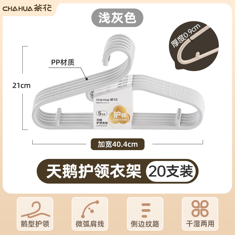 茶花家用天湖护领衣架宿舍衣架居家收纳衣架 灰色【20支装】天鹅护领衣架