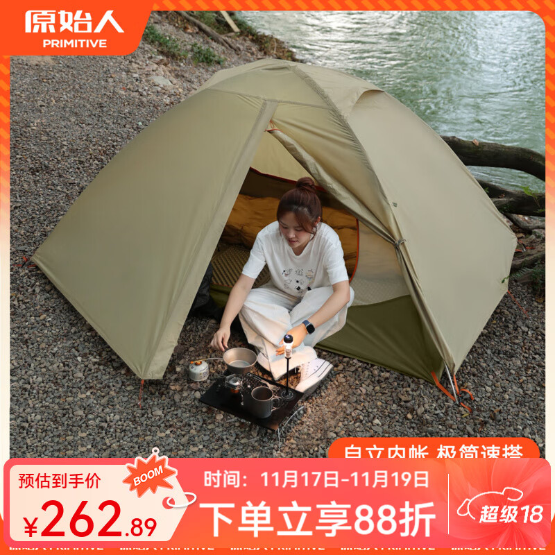 原始人徒步帐篷户外露营野营过夜便携加厚防雨防风专业登山轻量铝杆折叠 橄榄灰1-2人-超轻铝杆 抗风抗压