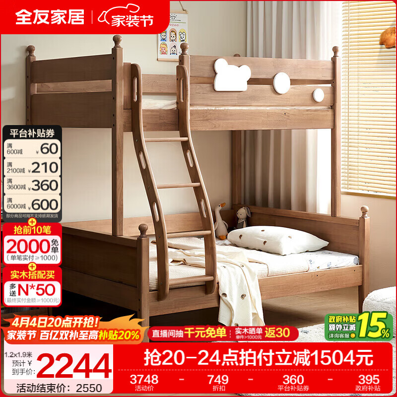 全友家居儿童上下铺全实木双层高低床带护栏男孩女孩小户型收纳储物床 橡胶木|上下床 1.35x1.9米
