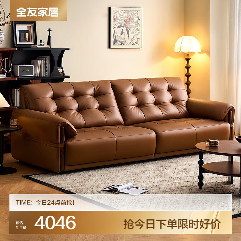 全友家居线下门店同款卢卡沙发复古风头层牛皮真皮沙发客厅沙发U10001 【焦糖棕 | 牛皮】3.06m直排沙发