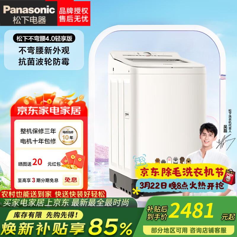 松下(Panasonic)白月光不弯腰4.0轻享版全自动波轮洗衣机10kg大容量家用智洗内筒抬高抗菌除螨 XQB100-8UF1 波轮