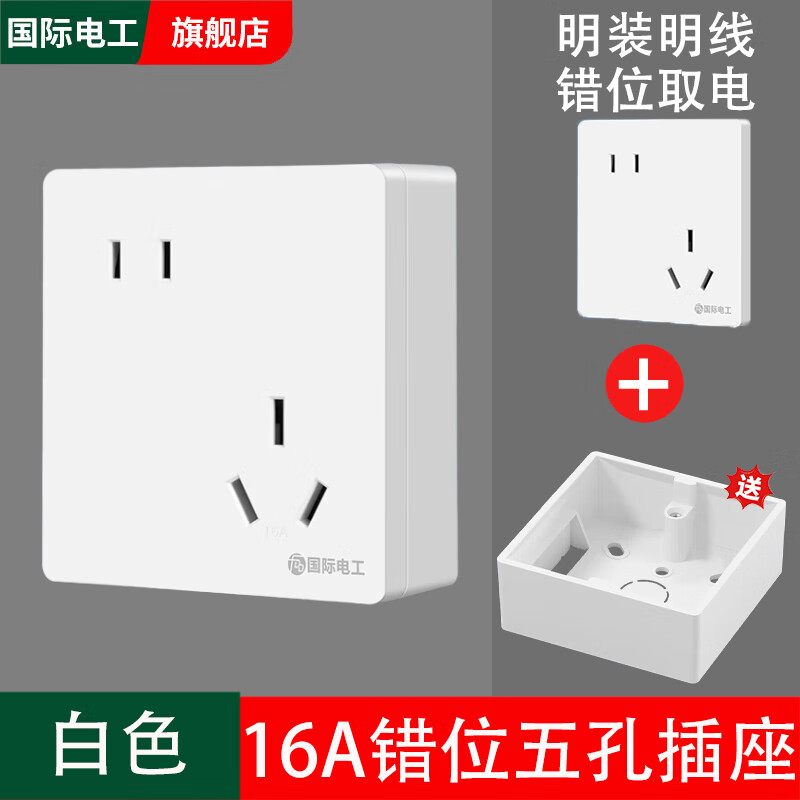 国际电工明装超薄错位五孔面板家用墙壁明线空调斜5孔16A三孔热水器插座 【明装带底盒】 白色 错位五孔16A