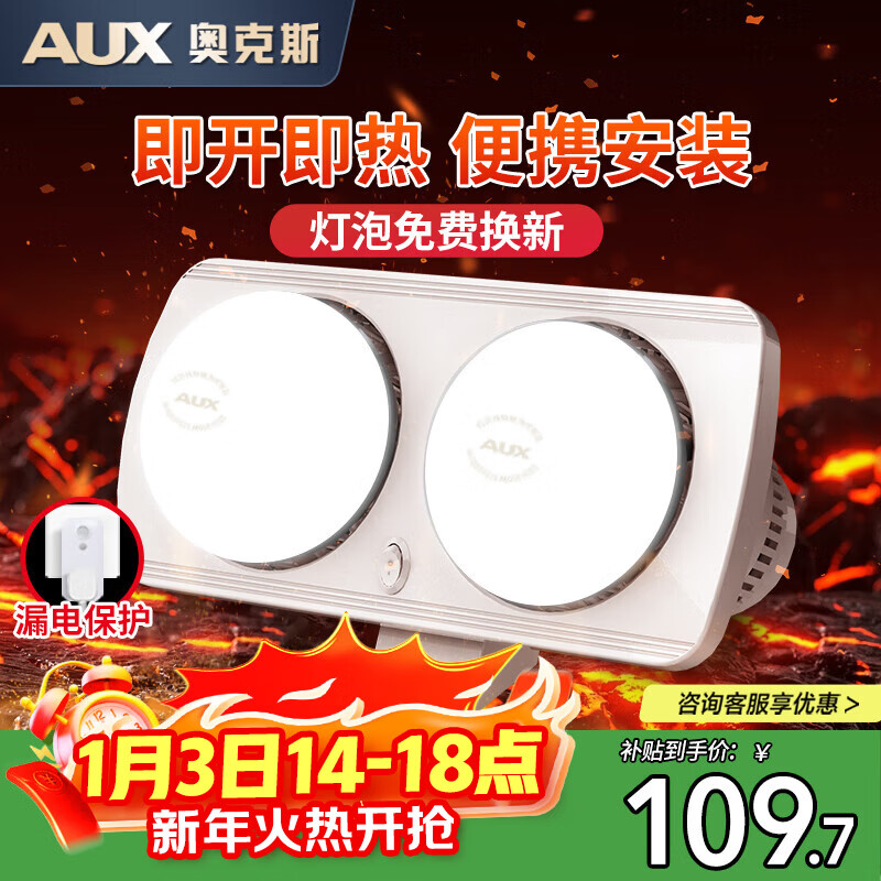 奥克斯(AUX)浴霸壁挂式卫生间灯暖挂壁式风暖浴室暖风机灯泡取暖器挂墙式暖灯 A款二灯-护眼泡【免打孔+漏保】