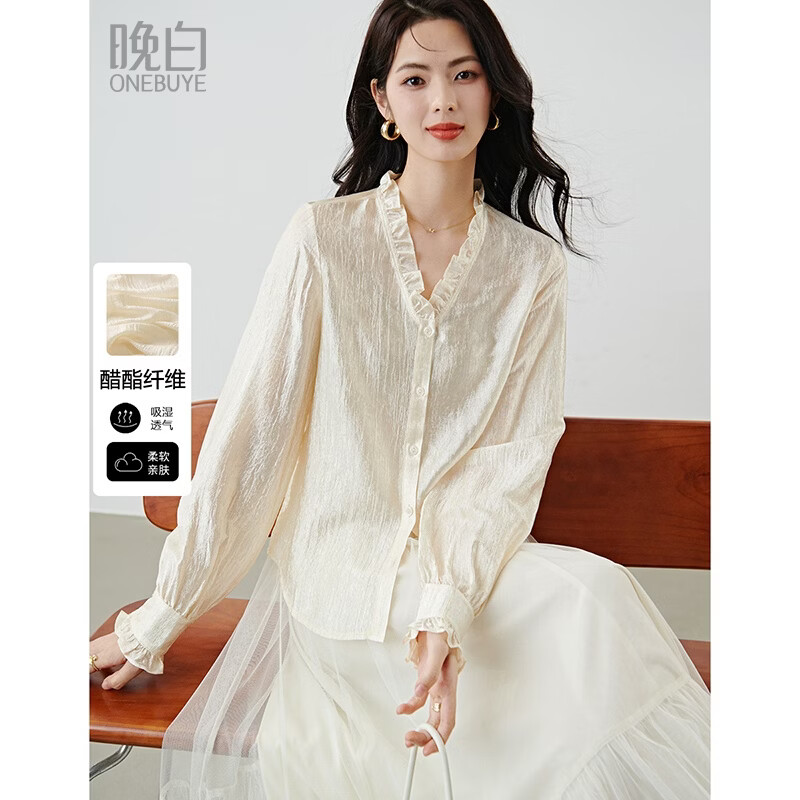 晚白2026年春款时尚木耳花边领醋酸上衣顺滑柔软显白千金风肌理感衬衫 杏色 M