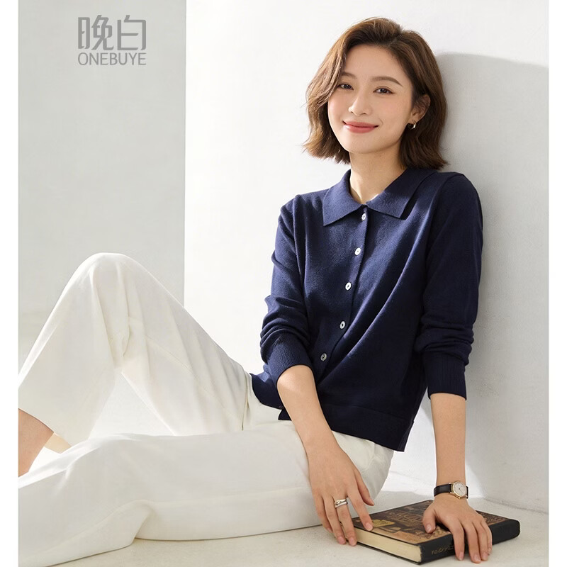 晚白【新品】2026年春款经典简洁翻领毛衣利落合身通勤百搭针织衫女 深蓝色 L