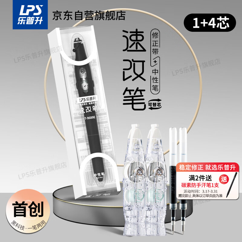 乐普升笔式修正带可替换芯小学生初中生专用黑科技改正带速改笔中性笔+修正带二合一改错带9689E黑+2+2