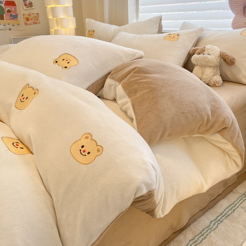 猫人牛奶绒床上四件套卡通刺绣2025新款秋冬珊瑚绒床单被套罩床品 奶油熊-白咖【高克重牛奶绒】 床单款 1.2m床【三件套】适150x200cm被芯