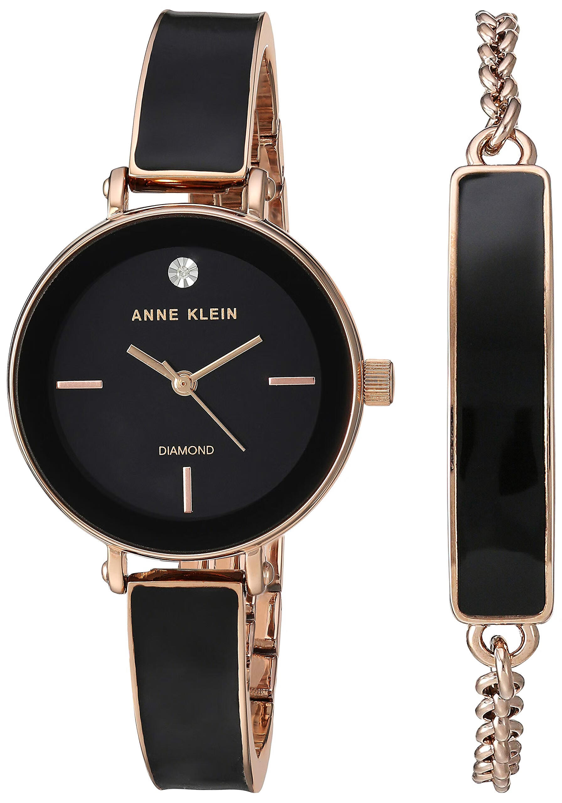 安妮克莱因(ANNE KLEIN) 女士石英腕表 真钻表盘 经典手镯式可调节 附链式手链 玫瑰金/黑色 30mm