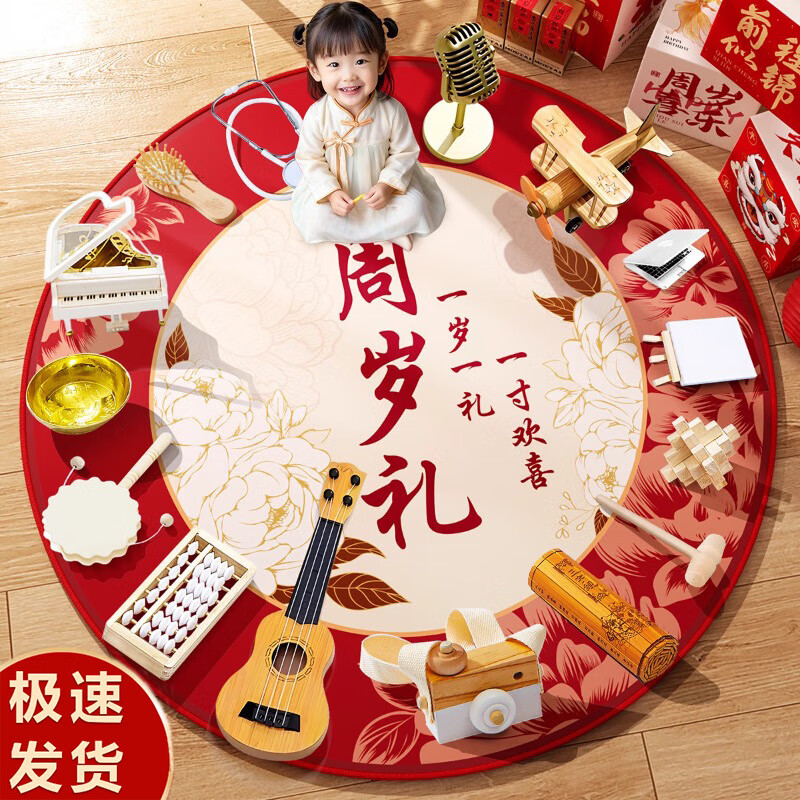 抓周道具用品一周岁套装男女宝宝生日仪式装饰布置抓阄礼原木地毯全套 国风周岁毯+原木风道具24件