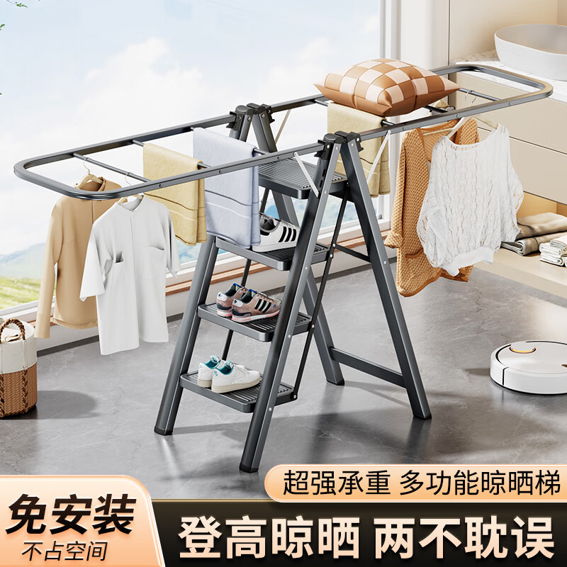 慕戈家用梯子折叠落地晾衣架两用多功能加厚室内人字梯伸缩晒被梯神器 加厚晾衣梯四步枪灰色-三挡可调