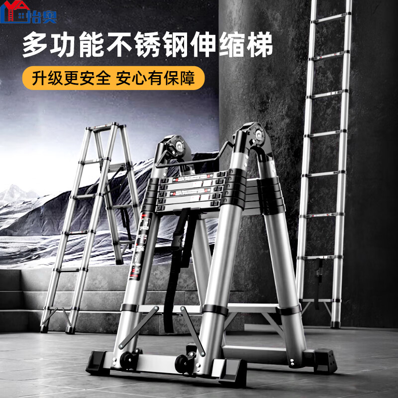 怡奥不锈钢梯子多功能伸缩梯子升降直梯折叠人字梯竹节梯加厚可折叠梯 人字伸缩梯1.8+1.8米